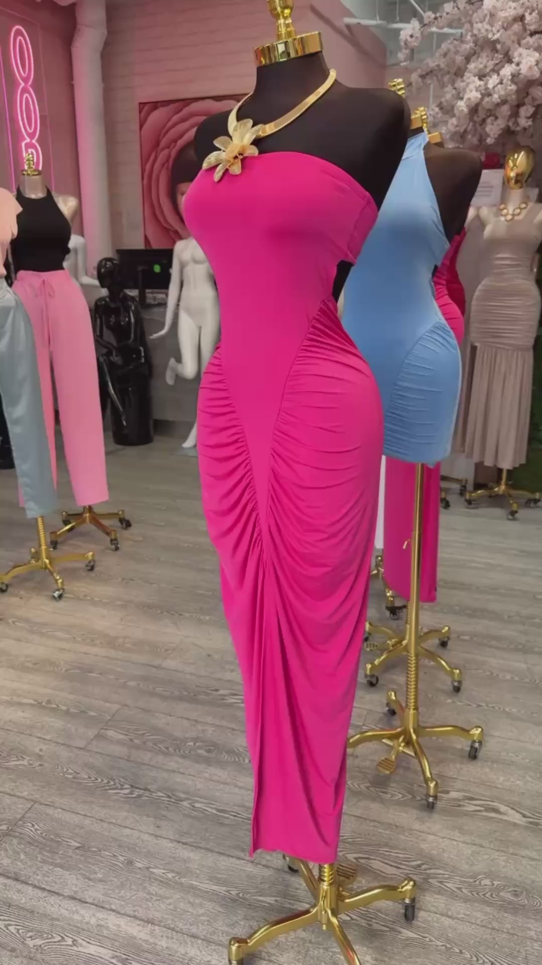 Fuchsia Strapless midi dress Mid Back Open Ruched bodycon fit Soft stretch fabric Midi length True to size
